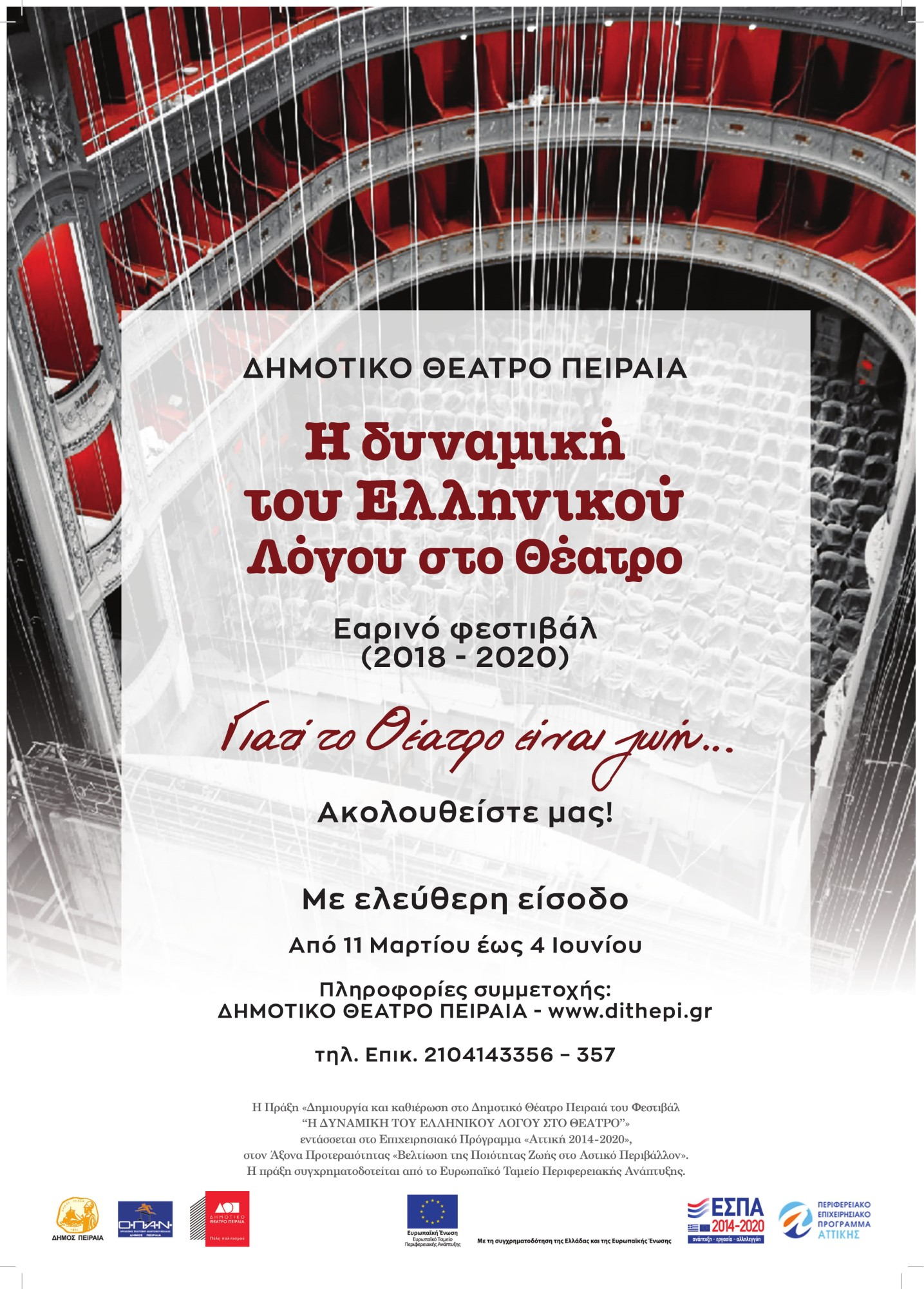 ** Το πρόγραμμα με θέμα: Δημιουργία και καθιέρωση στο Δημοτικό Θέατρο Πειραιά του Φεστιβάλ "Η δυναμική του Ελληνικού Λόγου στο Θέατρο", πραγματοποιείται στο πλαίσιο του Περιφερειακού Επιχειρησιακού προγράμματος «Αττική» (2014 – 2020) το οποίο συγχρηματοδοτείται από το ευρωπαϊκό Ταμείο περιφερειακής Ανάπτυξης (ΕΤΠΑ).