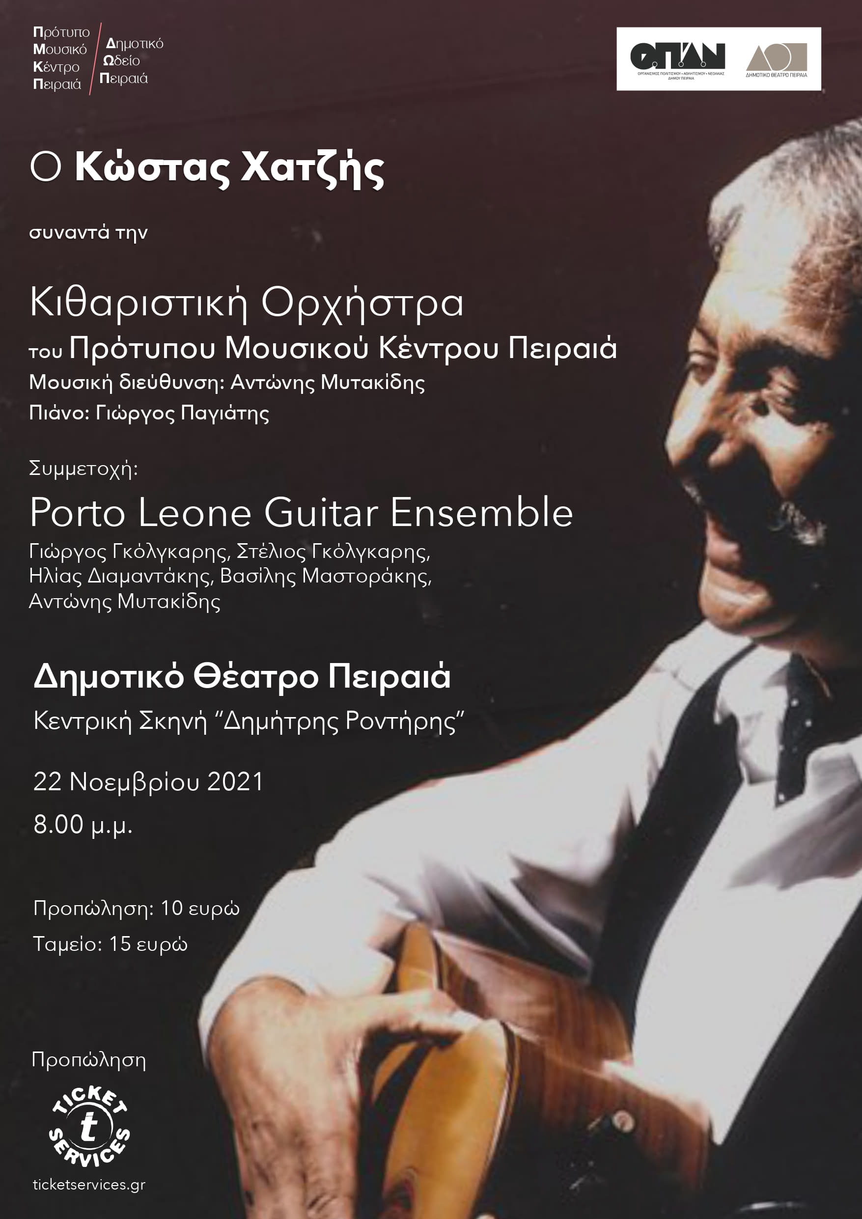 Την Δευτέρα 22 Νοεμβρίου, στην Κεντρική Σκηνή “Δημήτρης Ροντήρης” του Δημοτικού Θεάτρου, η Κιθαριστική Ορχήστρα Πειραιά και το Porto Leone Guitar Ensemble (Γιώργος Γκόλγκαρης, Στέλιος Γκόλγκαρης, Ηλίας Διαμαντάκης, Βασίλης Μαστοράκης, και Αντώνης Μυτακίδης), θα συμπράξουν με τον γνωστό τραγουδοποιό, σε ένα πρόγραμμα που θα ανατρέχει στις σημαντικότερες στιγμές της πολυετούς δημιουργικής του πορείας.