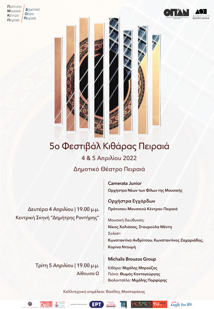 Το Πρότυπο Μουσικό Κέντρο Πειραιά και το Δημοτικό Θέατρο Πειραιά, υπό την αιγίδα του Ο.Π.Α.Ν., και με την συμπαράσταση του Συλλόγου Ελλήνων Κιθαριστών, διοργανώνουν το 5ο Φεστιβάλ Κιθάρας. Στο πλαίσιο της φετινής διοργάνωσης θα πραγματοποιηθούν δύο εκδηλώσεις.