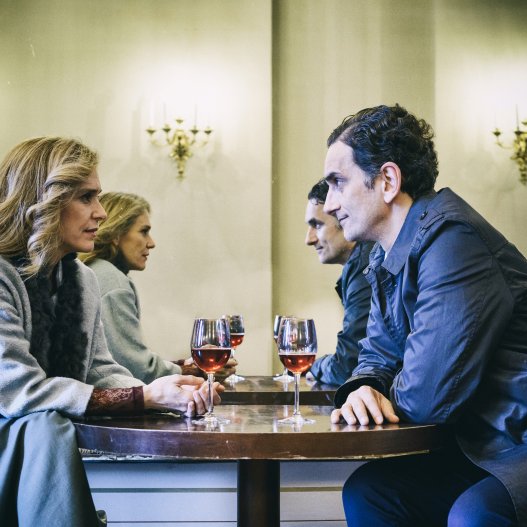 Το κοινό μετακινείται βιαστικά από το φουαγιέ στην είσοδο του θεάτρου. Η κεντρική πόρτα κλείνει. Ο Γιώργος Γλάστρας, ο οποίος υποδύεται τον απατημένο της ερωτικής ιστορίας, παίρνει θέση απέναντι στον πρώην εραστή της συζύγου του, τον Νίκο Ψαρρά. Παύσεις και λεπτό χιούμορ. Οι θεατές παρακολουθούν τον διάλογο ανυπόμονα, σαν μια γρήγορη παρτίδα πιγκ πογκ. Τα βλέμματα πηγαινοέρχονται από τον έναν αντίπαλο στον άλλον.